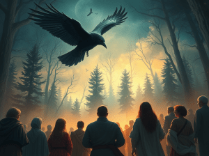 Ik begeleidde een groep bij het zingen van een lied om Raaf aan te roepen, om ons te helpen bij het gidsen van zielen naar de andere wereld.