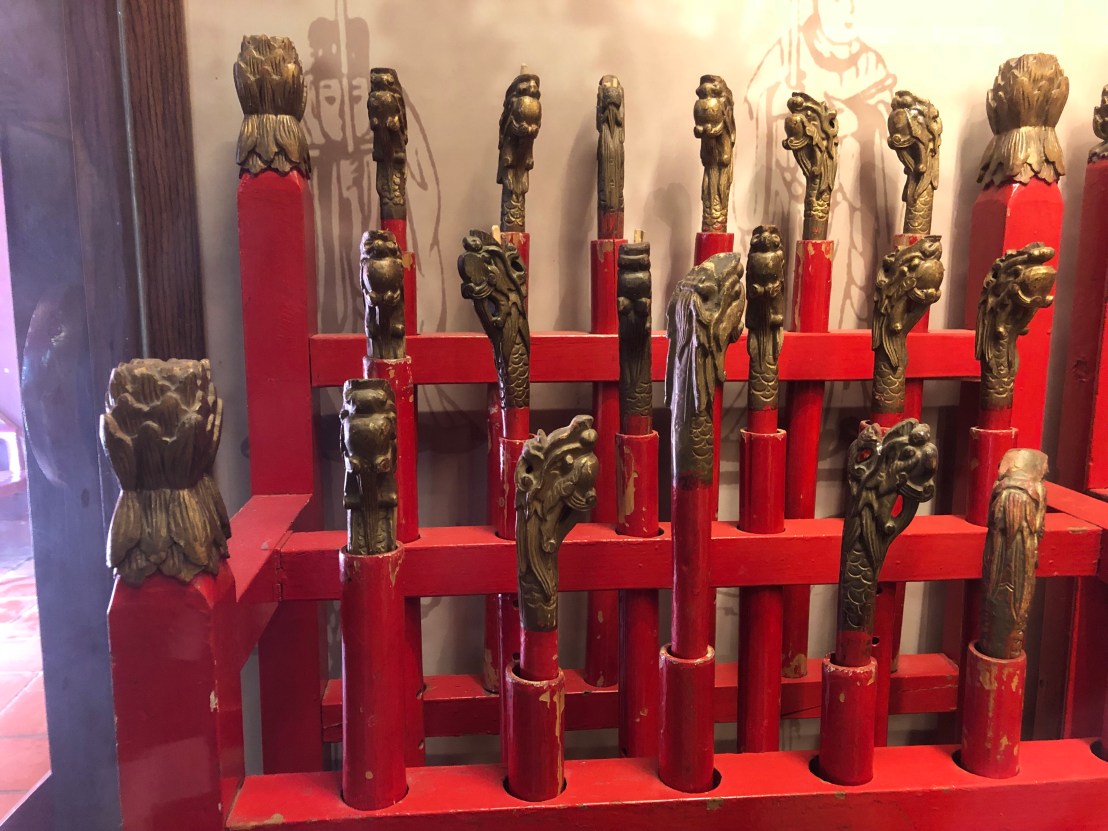 Een interessante opstelling zag ik bij de verzameling van staven, die gebruikt worden bij de Confucianistische dansen ter inwijding van nieuwe studenten. Volgens mij zijn dit de laatste resten van het oude sjamanisme, voorzover die nog bewaard zijn in het Confucianisme.