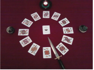 I remove all the courts from a deck of playing cards, and lay them out on the cloth in a ring, in the following order: