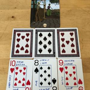 9♦ – 9♠ – 10♥: fame-coffin-happiness; standing out in the crowd-confronting isolation-achieving happiness.
