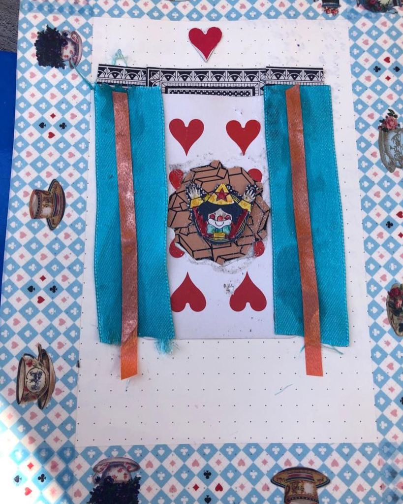 The choice of colors — greens, blues, and warm floral hues — harmonizes well, enhancing the earthy yet whimsical aesthetic. The thoughtful layering and textured arrangement give depth to the piece, making it visually engaging from multiple perspectives.