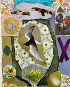 This collage presents a vibrant and dynamic composition that beautifully blends elements of nature, wildlife, and human observation. The central figure of a black tern in graceful flight stands out against a patterned circular backdrop, drawing the viewer’s attention and symbolizing freedom and exploration.