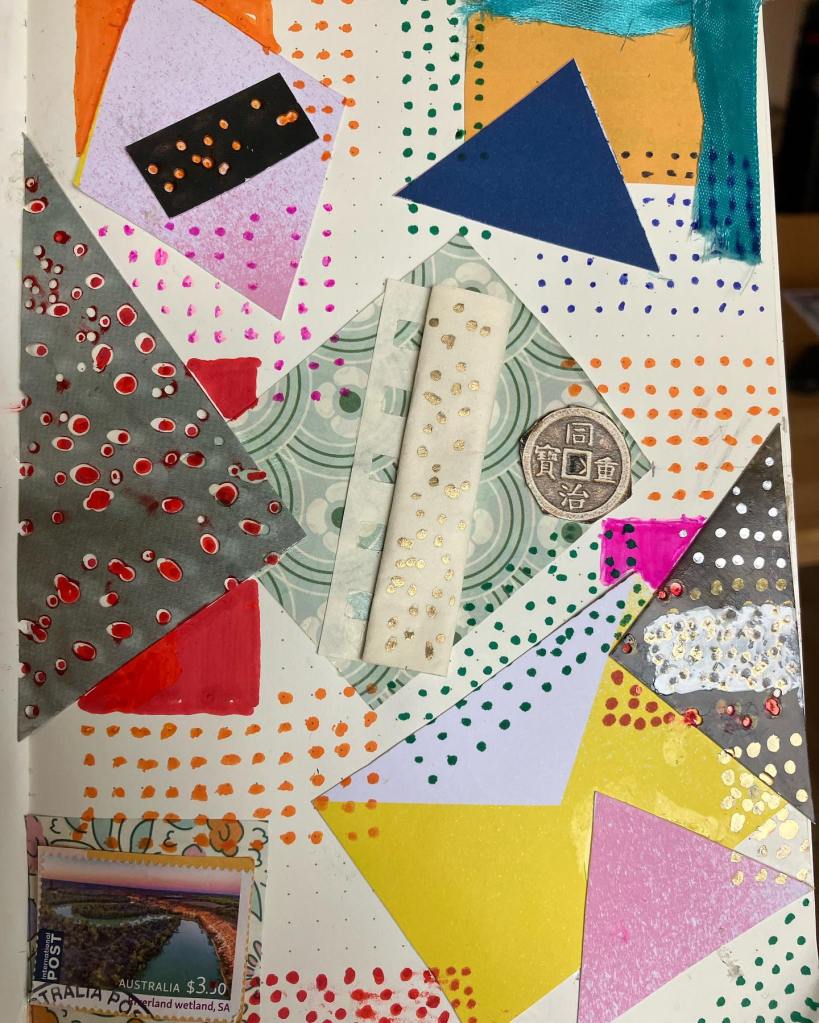 This collage has a vibrant and playful composition with a dynamic mix of textures, shapes, and colors. Here’s my detailed review: