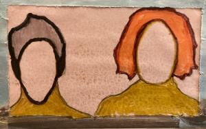 Contrast in Hair and Clothing: The two figures are differentiated by hair color and shape—one with dark hair and one with vibrant orange—while both wear a similar mustard-yellow garment.