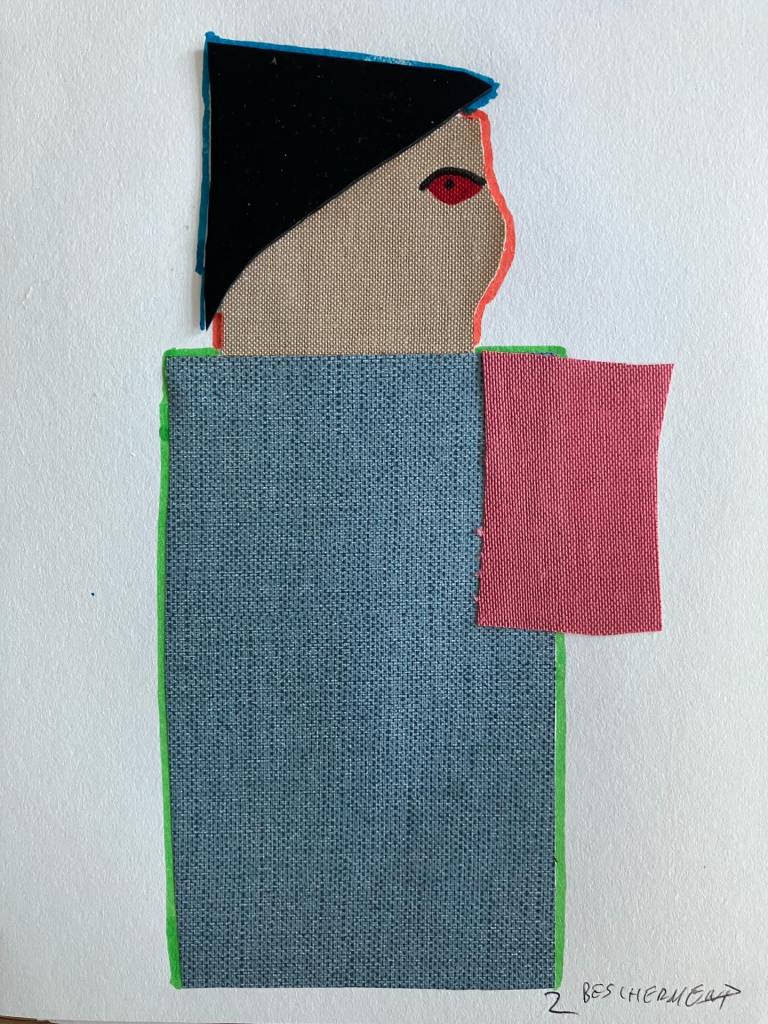 A tall, enclosed figure with a sharp, angled head and a single visible eye. The posture feels inward, guarded, slightly turned away.
