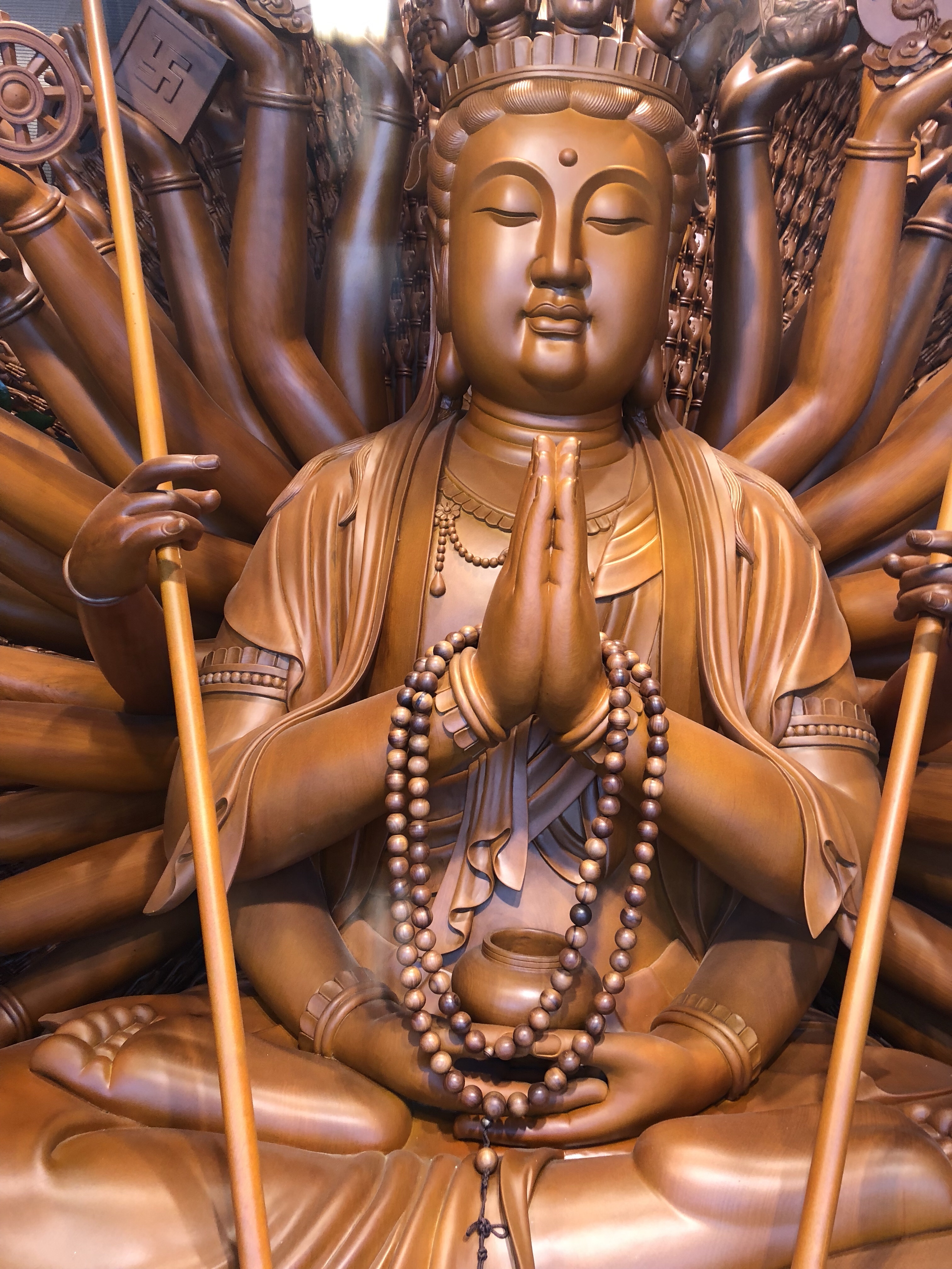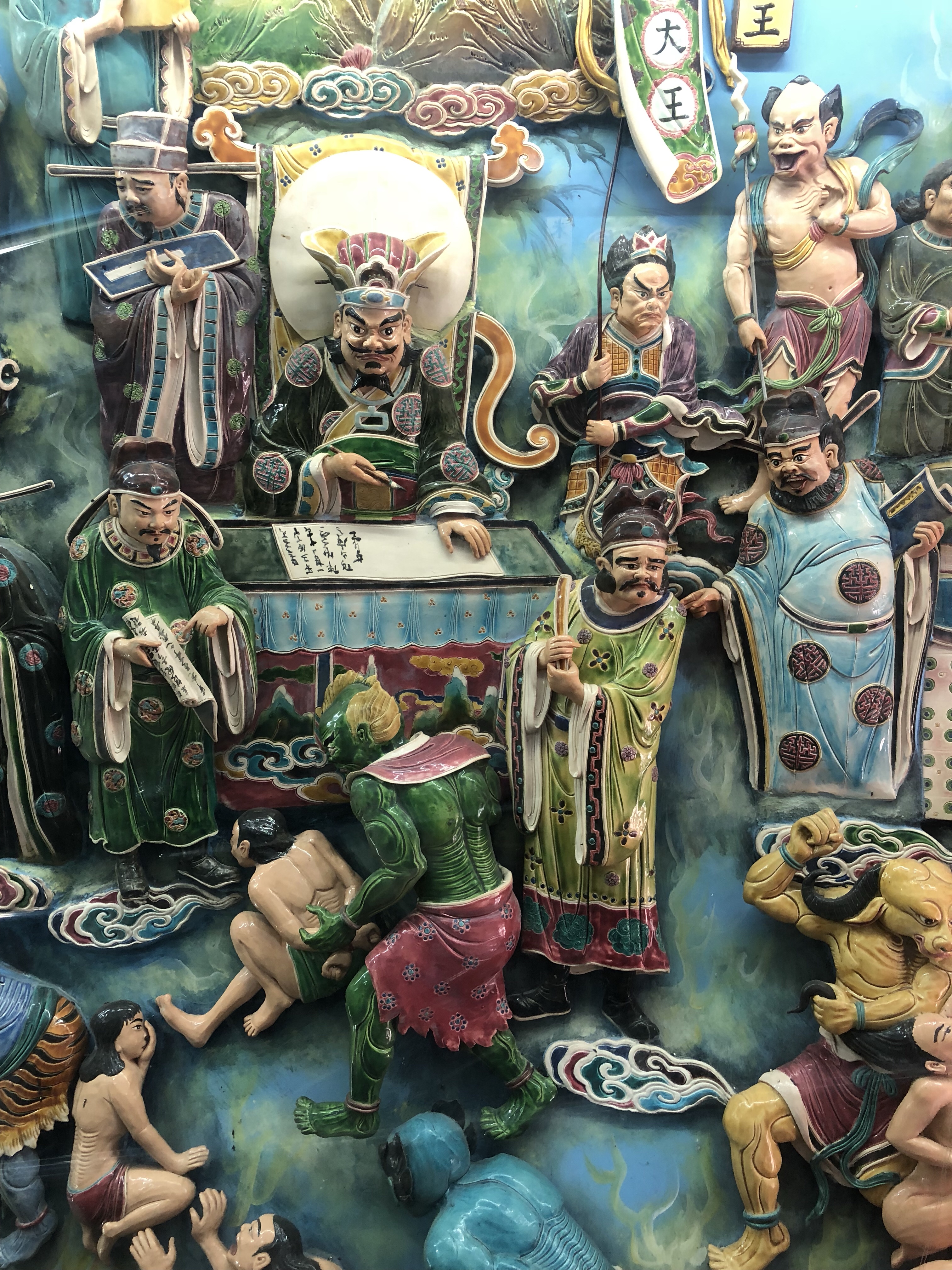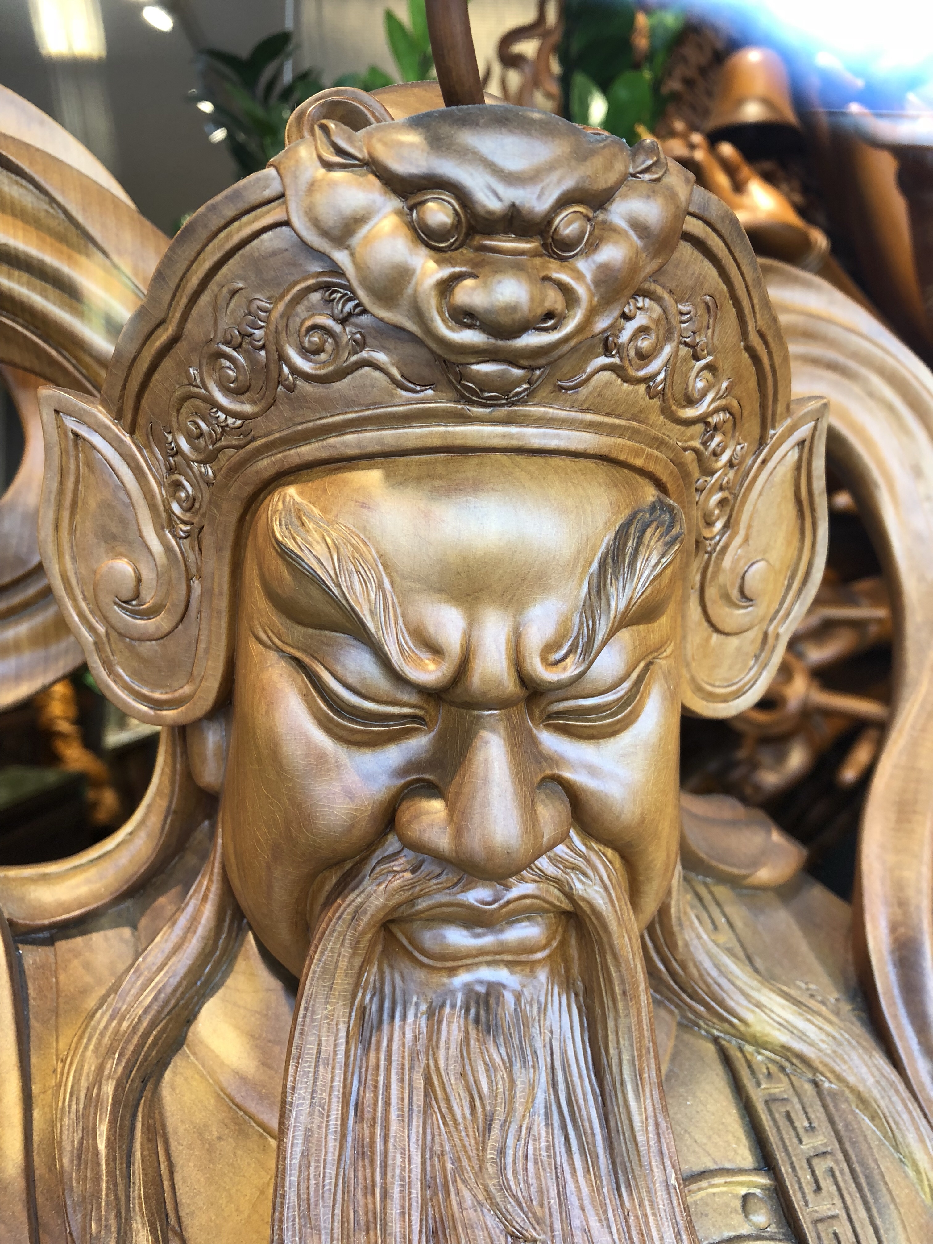 Even verderop een bijzondere houtwerk sculptuur: Guanyin geflankeerd door Guanyu en Skanda, zoals ze ook te zien is in de Chinese tempel te Zeedijk.