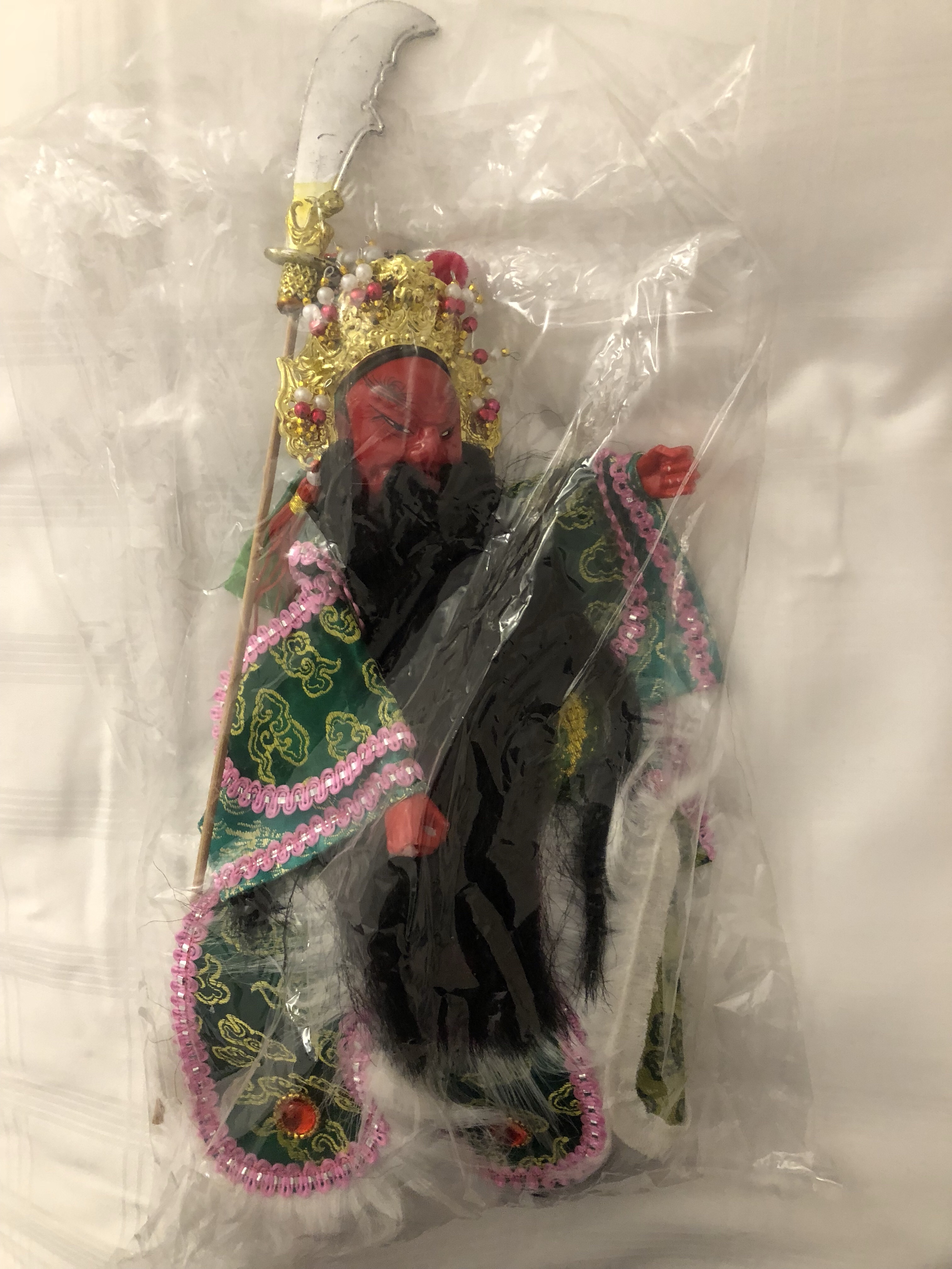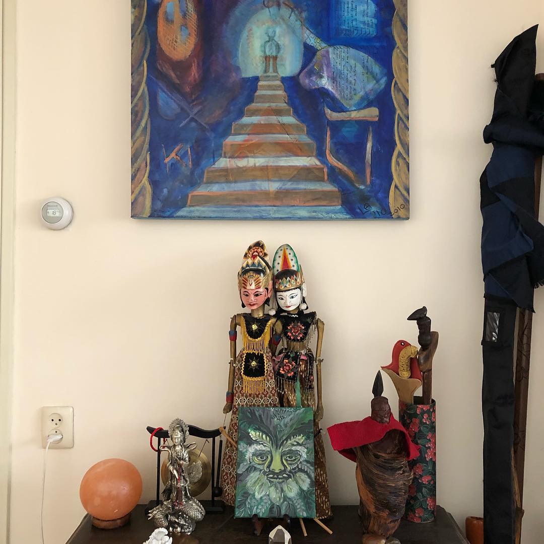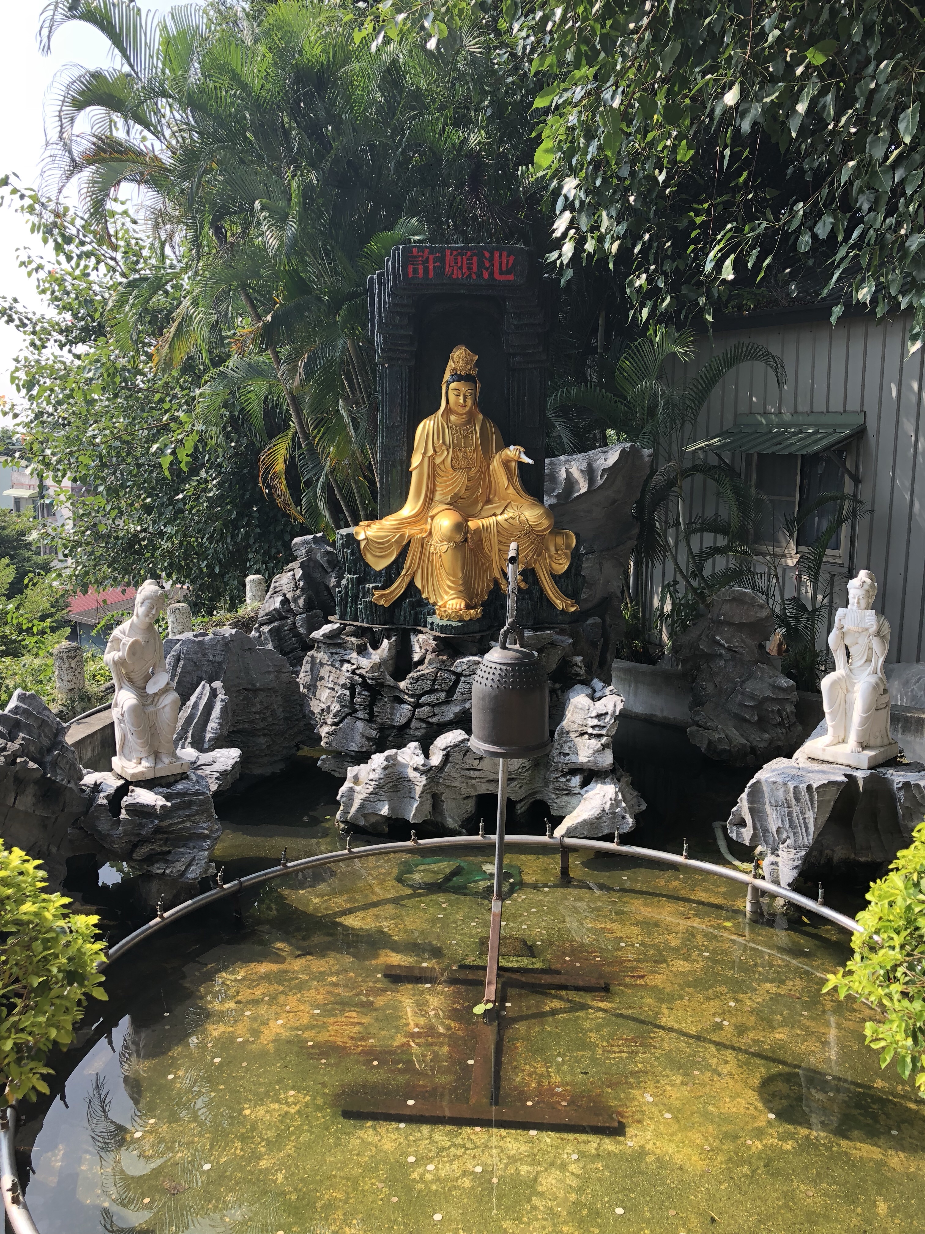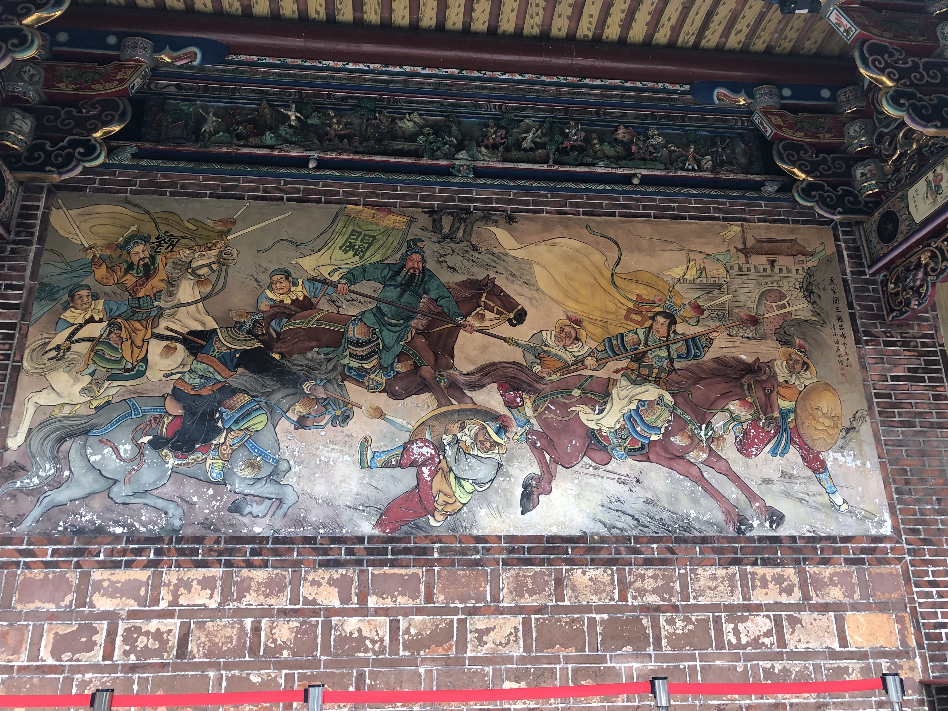 Even verderop een bijzondere houtwerk sculptuur: Guanyin geflankeerd door Guanyu en Skanda, zoals ze ook te zien is in de Chinese tempel te Zeedijk.