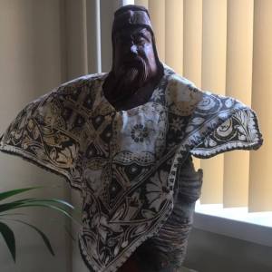 Color Palette: Earthy tones dominate (browns, whites, blacks, reds, and yellows), emphasizing the spiritual and historical nature of the figure.