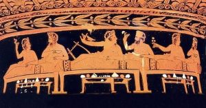 Symposion Heren op middelbare leeftijd filosoferen over de (Platonische) Liefde onder genot van wijn …was Aristophanes de comediant wel serieus met zijn tweelingziel verhaal?