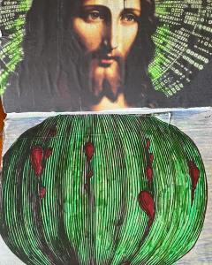 This is a visually striking mixed-media artwork with symbolic elements. The top half features a classical representation of Jesus Christ with a digital, cybernetic background made up of green code-like patterns, possibly referencing themes of divinity and technology. The lower half presents an abstract organic form, possibly resembling a cactus or a globe, with deep red teardrop-shaped markings that could symbolize wounds, suffering, or transformation.