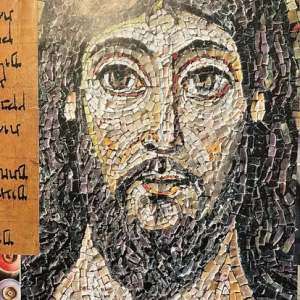 This image appears to be a mosaic-style portrait of a man resembling traditional representations of Jesus Christ. The portrait is composed of small, square tesserae (tiles) in various colors, creating a textured, intricate depiction. Some specific observations: