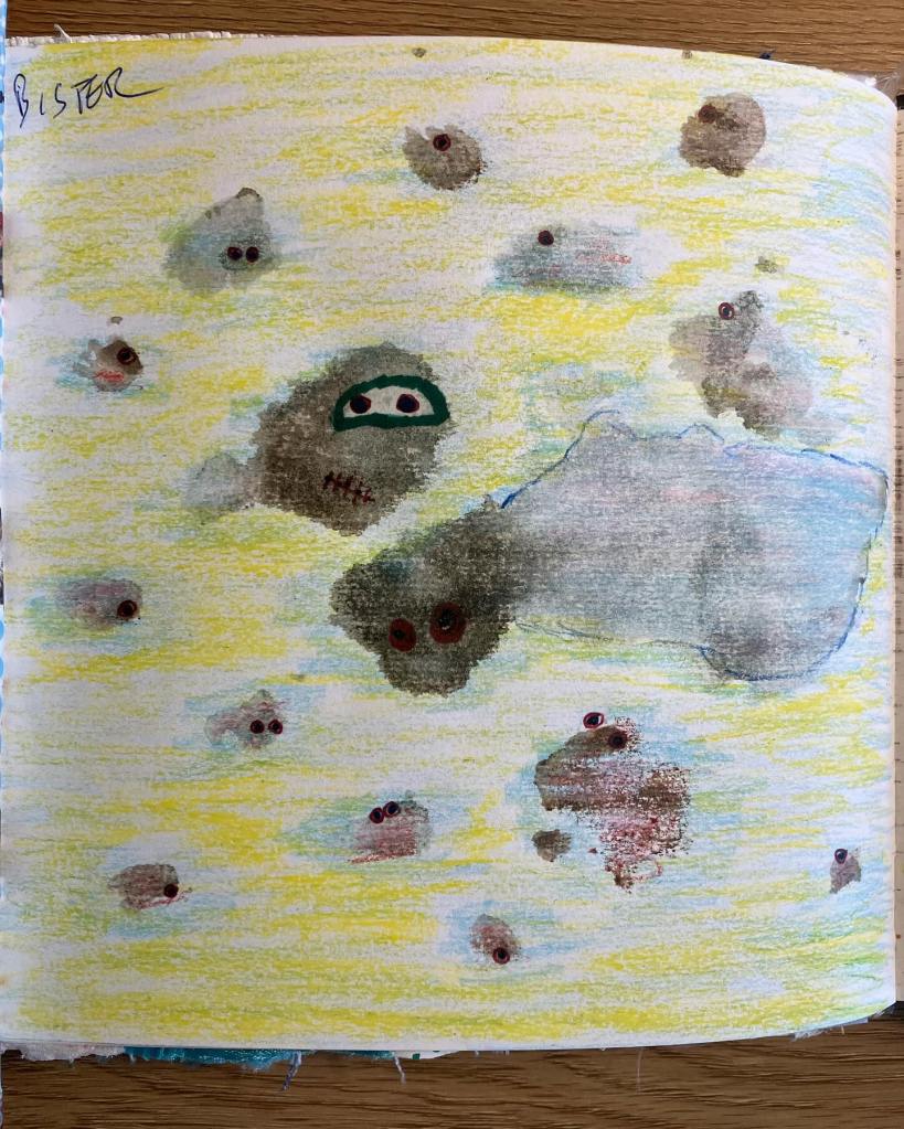 Layered Text and Scribbles – The handwritten cursive text appears chaotic and layered, which might signify fragmented thoughts, subconscious reflections, or a sense of urgency. Some words like “bad leaves” and “time” are visible, possibly hinting at themes of change and impermanence.