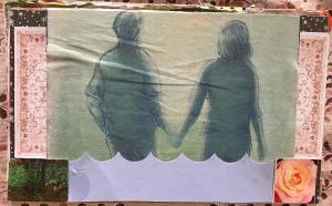 This is a mixed-media collage featuring a hand-drawn or printed illustration of a couple holding hands, seen from behind. The artwork has a dreamy, nostalgic feel, emphasized by muted colors and soft textures.