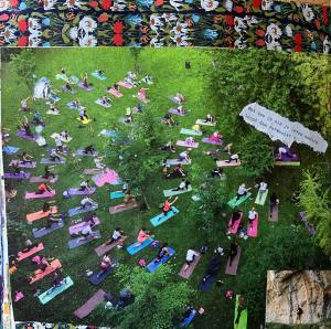 The main image is an aerial photograph of a large outdoor yoga session in a lush green park. The colorful yoga mats create a vibrant contrast against the grass, adding a rhythmic and dynamic pattern.