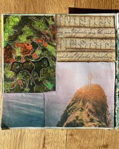 ### Overall Impression: This collage plays with nature, texture, and history. The mix of abstract imagery, aged writing, and photography suggests themes of exploration, memory, and the connection between the natural and human-made worlds.