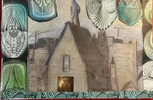 - The symmetry of the central diamond shape contrasts beautifully with the jagged, chaotic patterns and animal forms — a tension between order and raw expression.