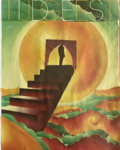 The circular cutout within the composition shows a starry night sky with the Milky Way, and a figure standing on a mountaintop, which adds a sense of wonder and connection to the vastness of the universe.The contrast between the earthy tones of the landscape and the deep cosmic colors in the circular image draws attention to the subject of human exploration and the vastness of nature and space.
